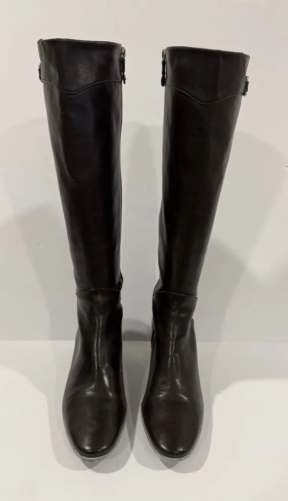 Classic Cole Haan knee-high leather boots in dark brown / espresso. Timeless, polished silhouette wi... Show more