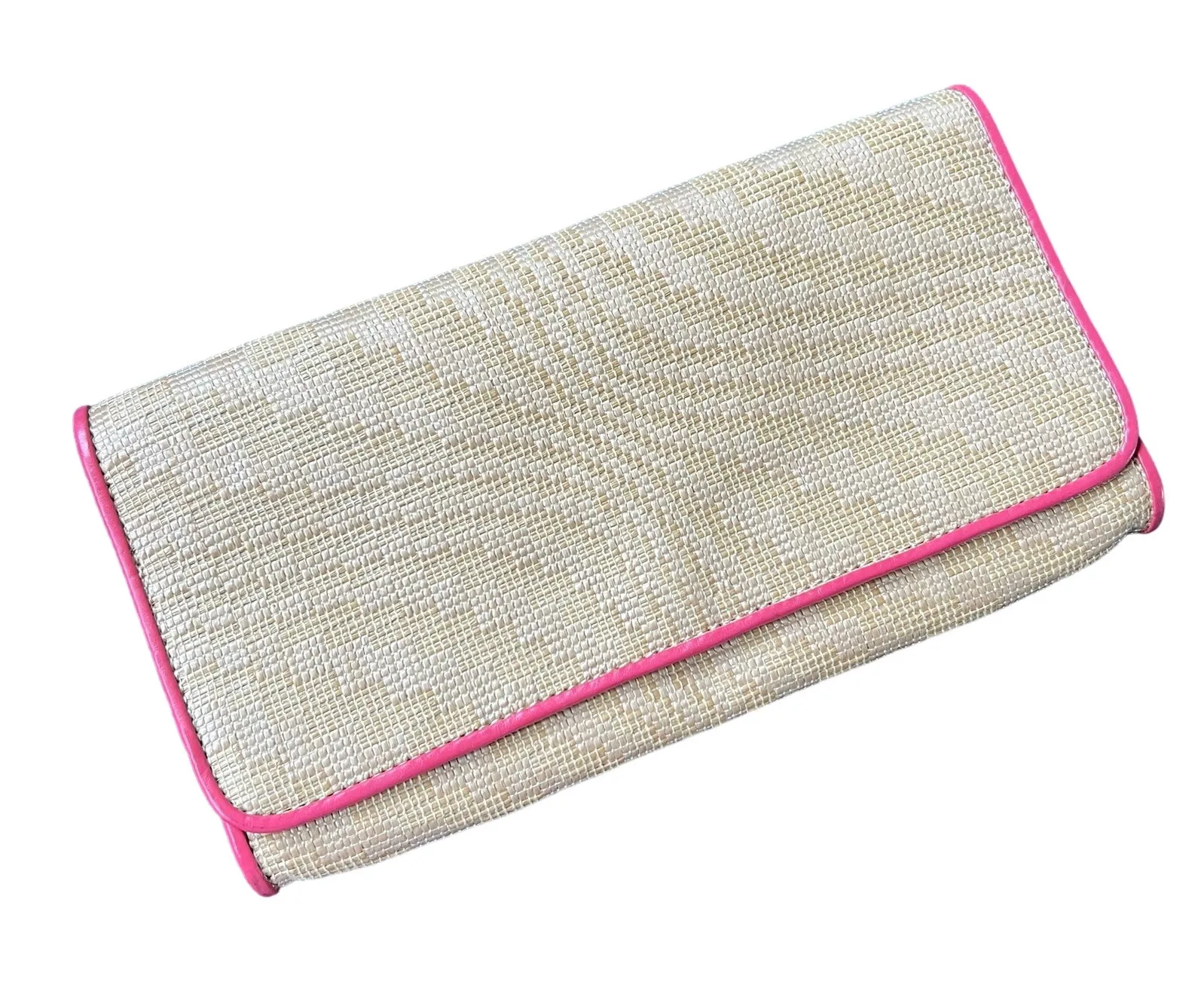 Cole Haan Genevieve Woven Clutch Woven straw body Pink trim Interior mirror Interior zip poc... Show more
