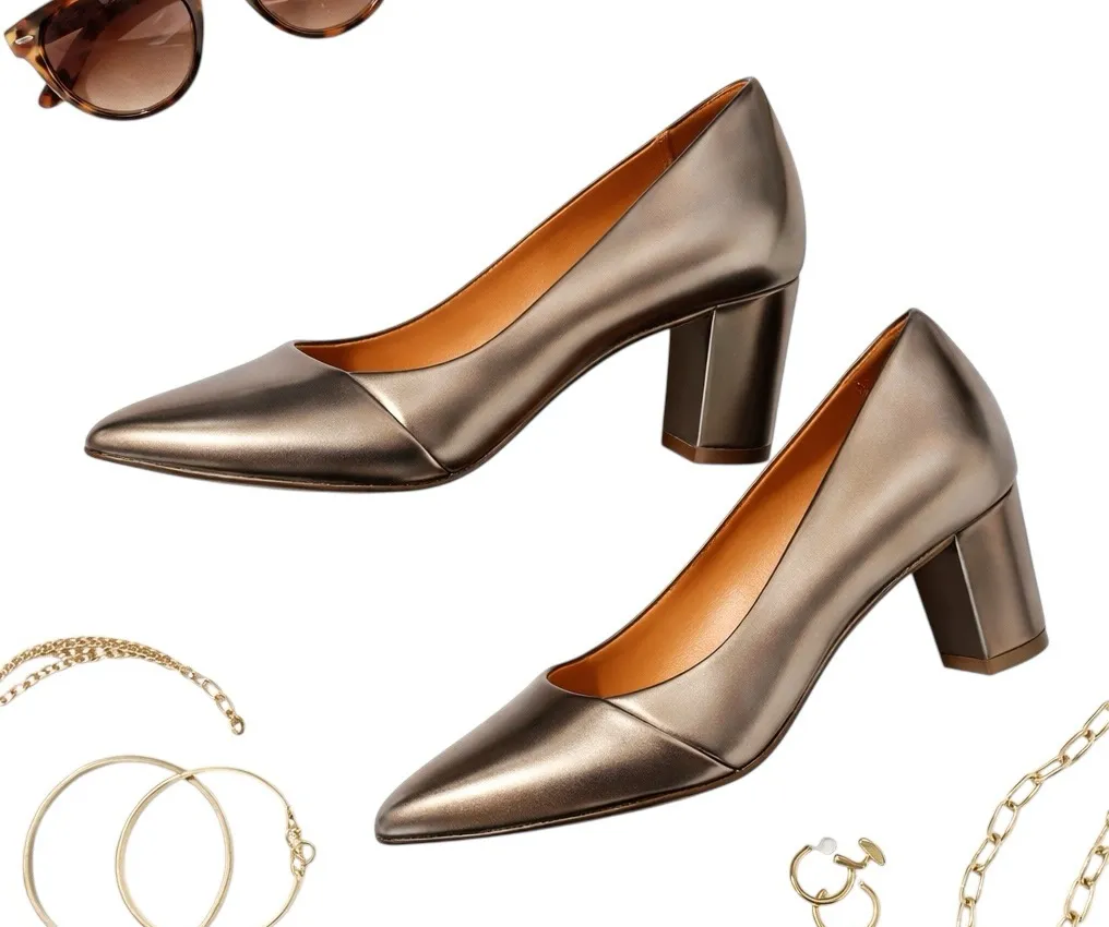 Cole Haan Grand OS pumps in bronze mirror leather with a pointed toe and stable block heel. The meta... Show more