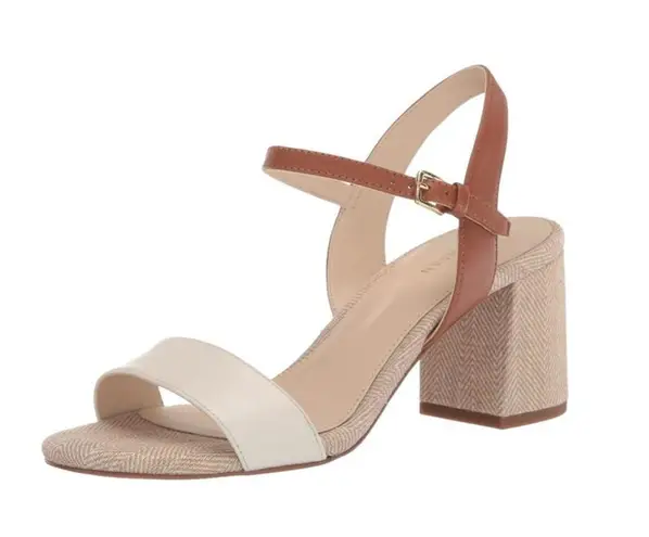 Elegant block heel sandal with cream and brown straps. Perfect for stylish outings. 081225