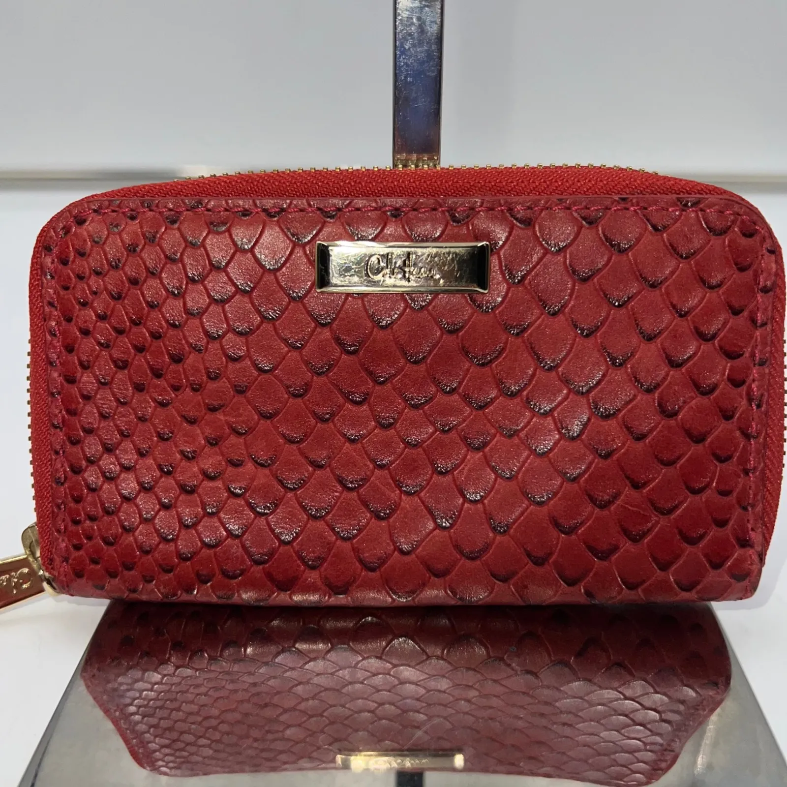 Keywords: Clafton, red wallet, snakeskin wallet, wristlet, clutch, card holder, zip around wallet, women's