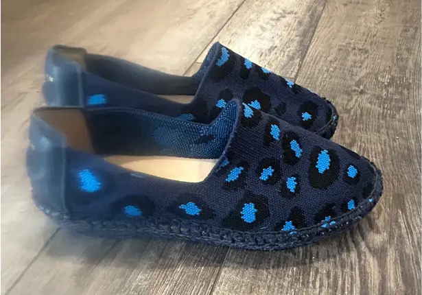 Cole Haan Women's navy blue espadrille flats showcasing a bold leopard print with vibrant blue and b... Show more