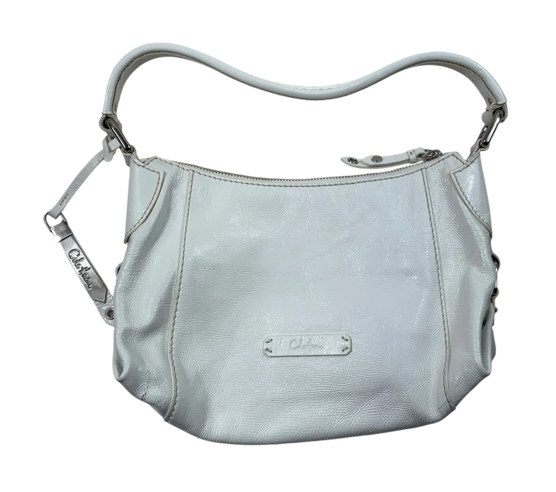 In good condition! Adorable and very trendy Y2K style! Shiny patent leather material. Silver hardwar... Show more