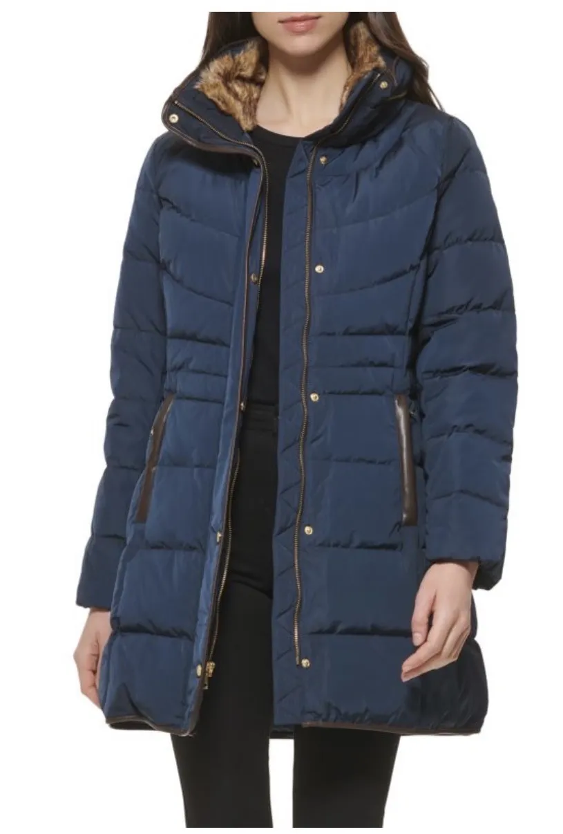 Cole Haan Women's Navy Shine Faux-Fur-Collar Hooded Puffer Coat Large Blue - $165 New With Tags - From Jaime