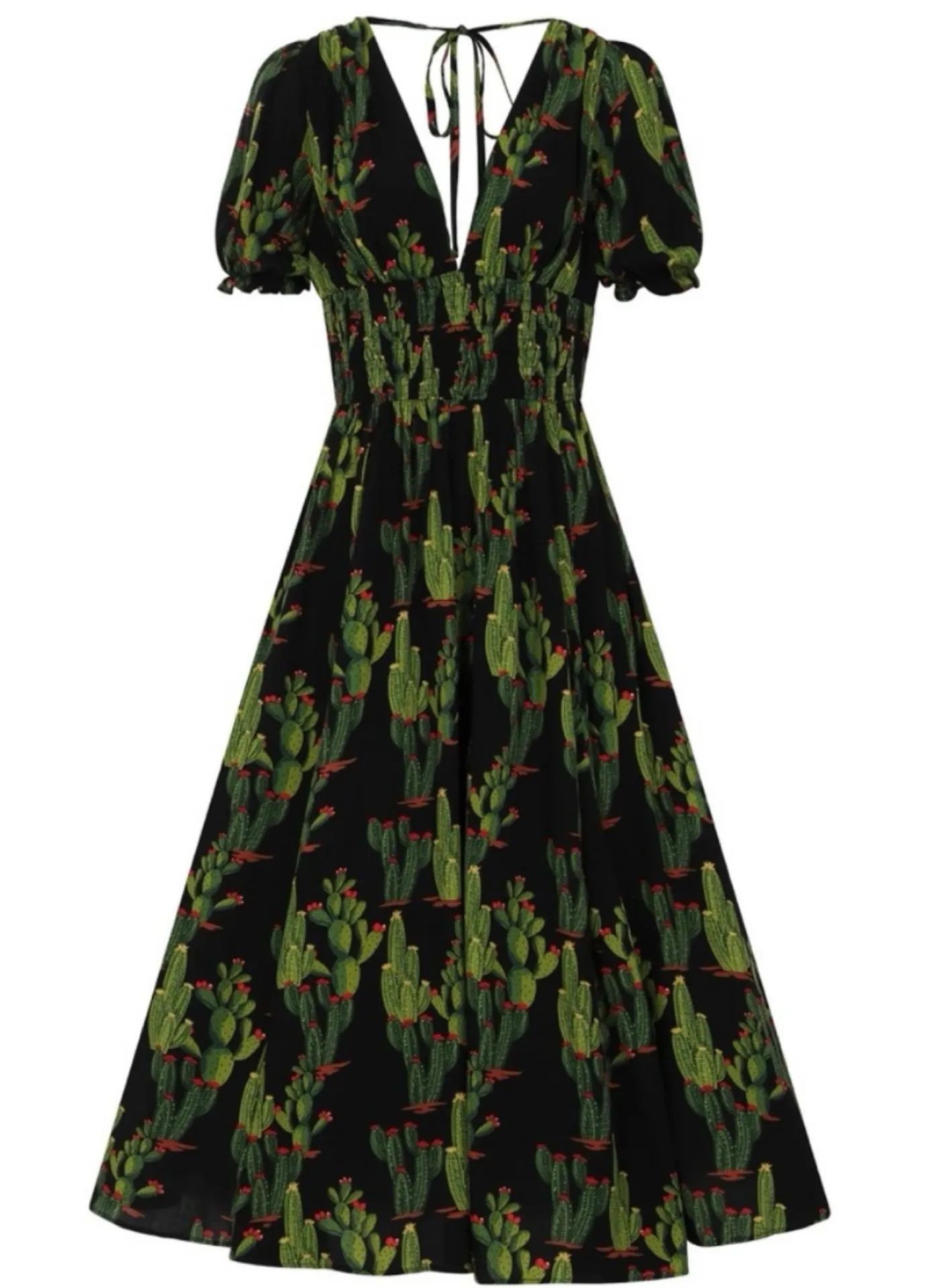 BRAND+CONDITION Collectif Gently Preowned; Excellent Condition SIZE+MEASUREMENTS •Plus US 16 // UK 20 — fits a 1X ~approx./unstretched/flat: •20.5–21” pit to pit •16.5” (elastic) waist; hips free DETAILS The Juliette Cactusland Midi Dress is perfect for lounging around in, during those warmer months! She’s made from lightweight, flowy viscose fabric which is covered in a bespoke kitschy print of cacti with red and yellow blossoms. She glides on over the head, as the dress is elasticated around the waist, and ties up around the back of the neck. She has a deep, plunging V-neck, extending to a low square shape at the back. She has short, puffy sleeves with frilly elasticated cuffs. Her flowy skirt starts at the waist and falls down to approximately the calf. CONTENT+CARE 100% Viscose Wash cold; Hang dry BIN19