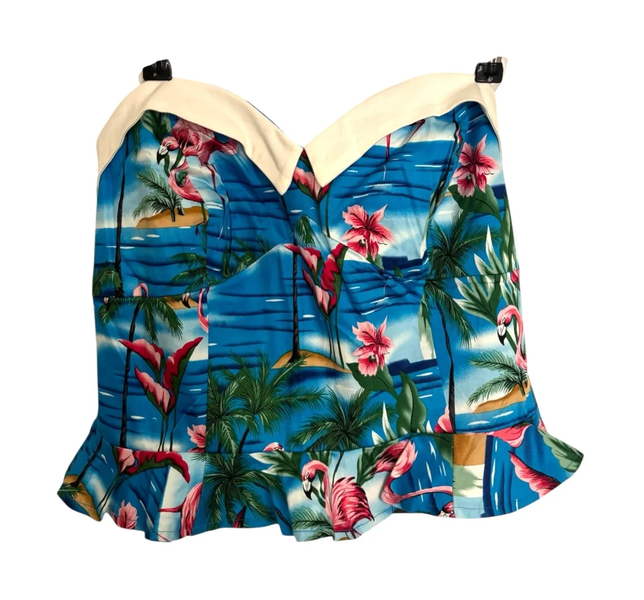 Collectif Ursula Flamingo Island Print Crop Top in blue with vibrant tropical flamingo print featuring pink flamingos, hibiscus flowers, and palm trees. This retro piece features a strapless sweetheart neckline with contrast cream trim, fitted bodice construction, and a flattering frilly peplum waist detail. Made from 98% cotton and 2% spandex with an elasticated back panel and back zip closure for a comfortable, secure fit. Brand new with tag. Hangar with visible black clips has been edited out of photo. Measurements: Armpit to armpit: 19" Top to hem: 10"