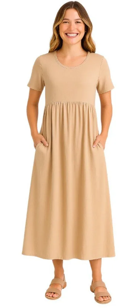 C.M.C Color Me Cotton beige oversized dress short sleeves flowy A-line skirt Size S Product Information Brand: C.M.C by Color Me Cotton Style: Casual midi /maxi dress. Color: Beige, tan, or sand. Features: Short sleeves, round neck, gathered waist, A-line/flared midi skirt, has pockets. Material: 100%cotton Measurements approximately Pit to Pit 19.5” Length 52” Condition Very good condition *Model for reference