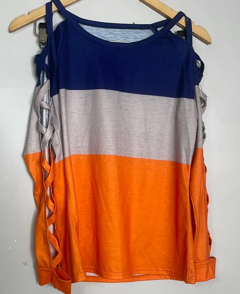 Stylish sleeveless top featuring a vibrant colorblock design. Perfect for casual outings, this top combines blue, gray, and orange for a bold look. Enjoy comfort and style with this must-have piece. Chicago bears colors!