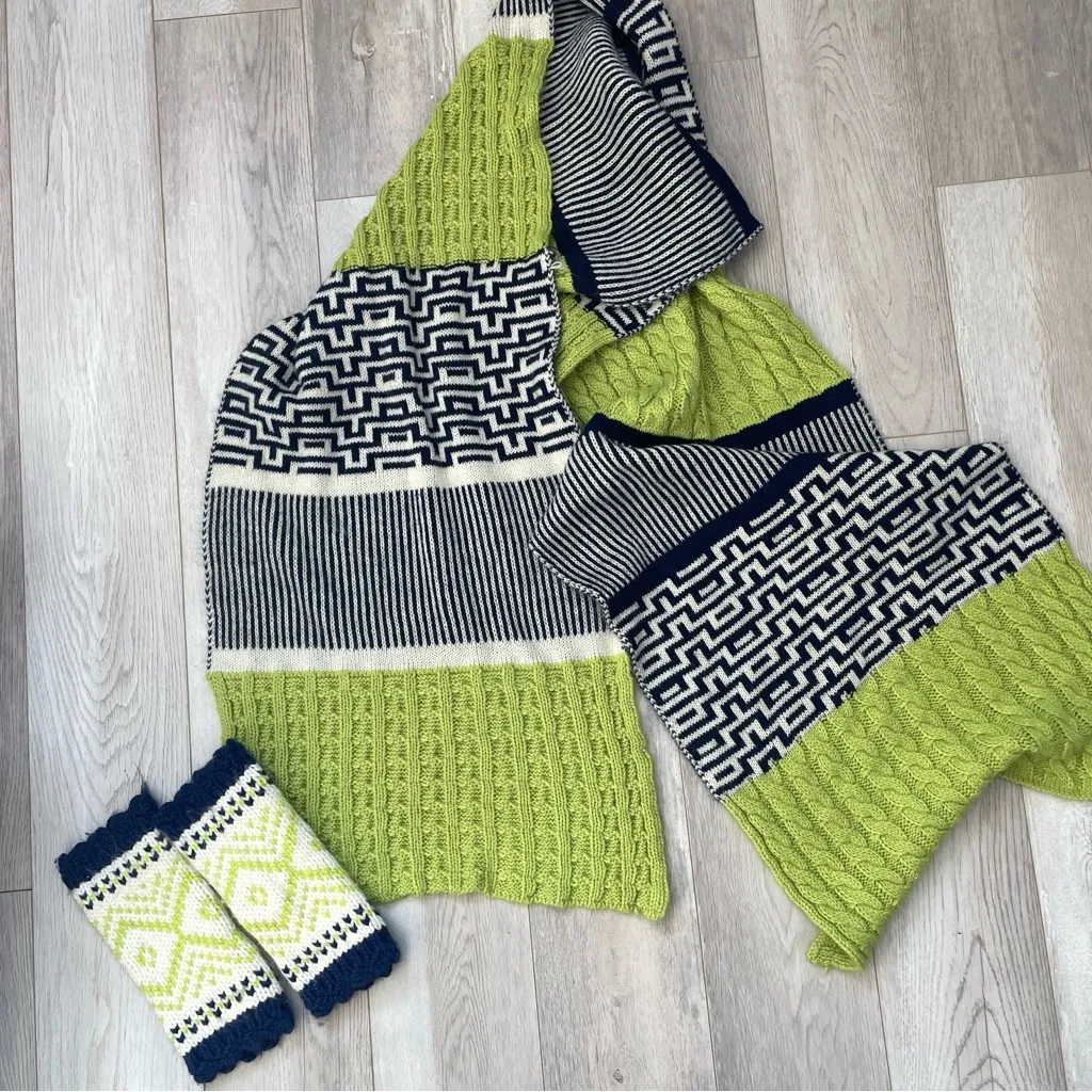 Colorful Knit Scarf + Arm Warmers set in the color Green and Navy Blue. Rectangular chunky knit scar... Show more