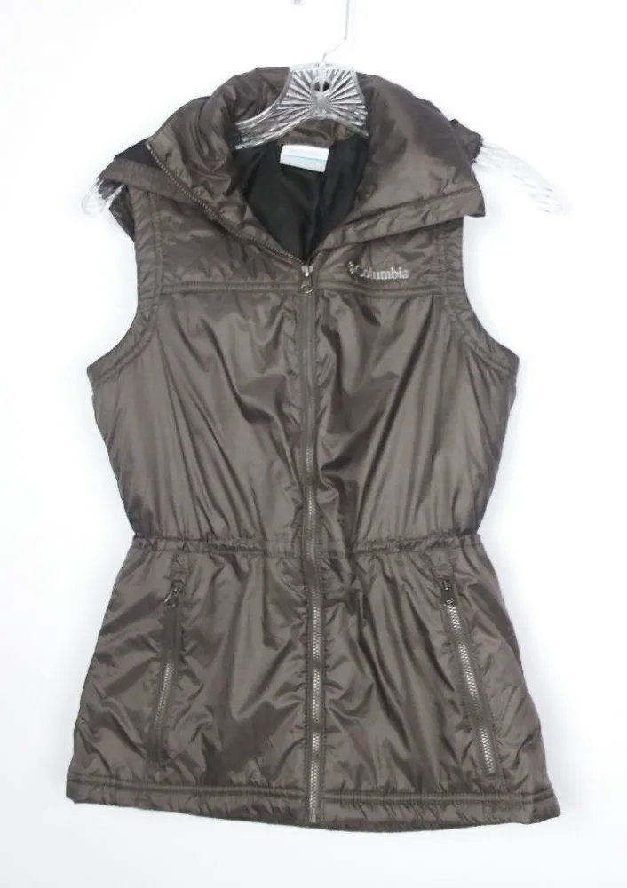 Columbia brown puffer vest with hoodie size XS. A couple unnoticeable spots as shown in the last pic... Show more