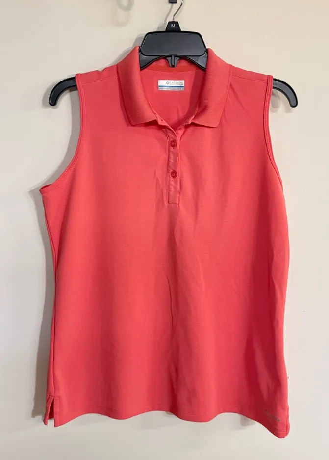 Columbia, Columbia Sportswear, Omni Wick, dry fit, athletic tank, sleeveless polo, polo tank top, workout top, activewear, athleisure, golf top, tennis top, hiking top, outdoor wear, moisture wicking, breathable fabric, lightweight, summer top, coral top, women’s active top, performance wear, casual sporty, travel wear, vacation activewear, fitness apparel