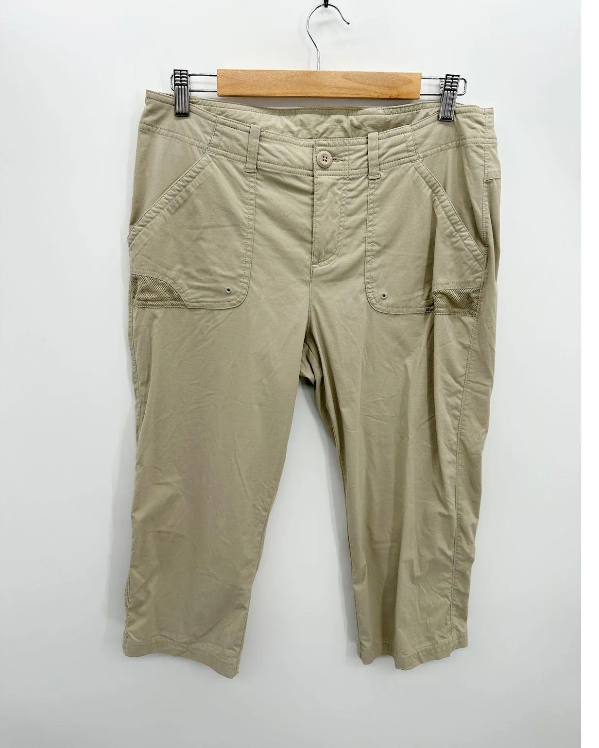 cropped capri khaki pants. cargo pockets. Size: 10 Condition: Pre-owned. Good Condition. No rips,... Show more