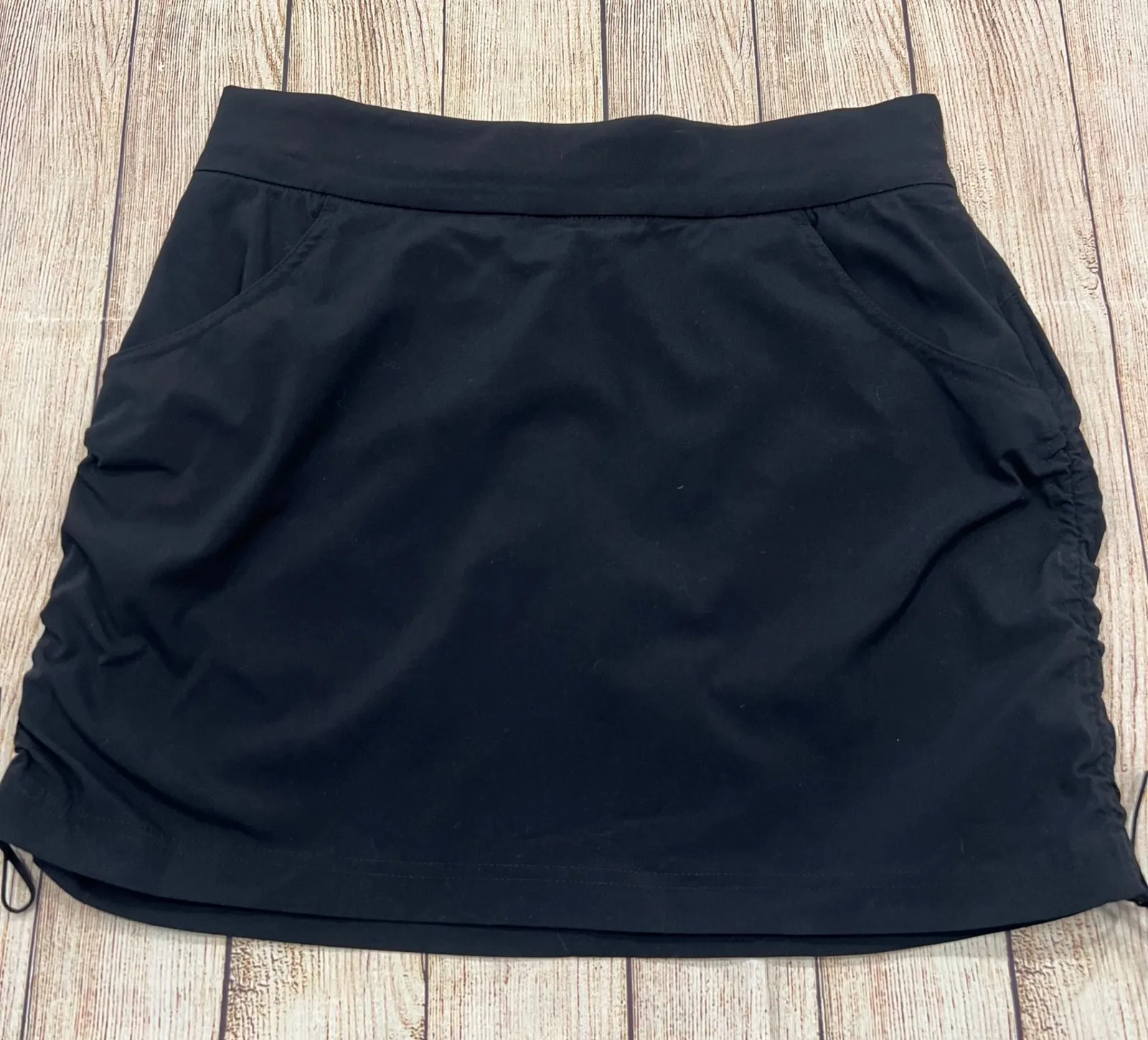 Columbia Sportswear athletic skirt shorts in black. Designed for performance and comfort, this versatile skirt features functional pockets and adjustable drawstring details on the sides for a customizable fit. Built-in shorts offer added coverage and ease of movement. Perfect for outdoor activities, sports, or casual wear.