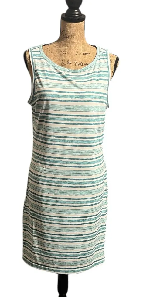 This stylish sleeveless dress features a classic striped pattern in blue and white. Perfect for casu... Show more