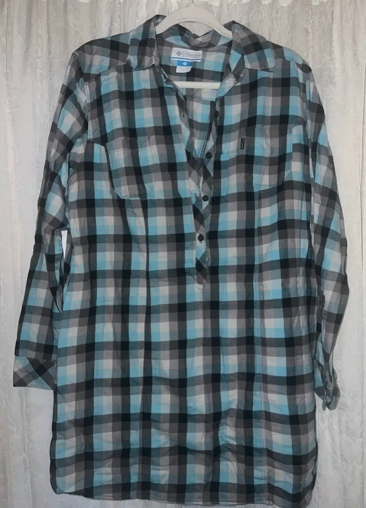 Columbia women’s size xl blue gray plaid long sleeve dress /tunic with pockets and tab sleeves in EU... Show more