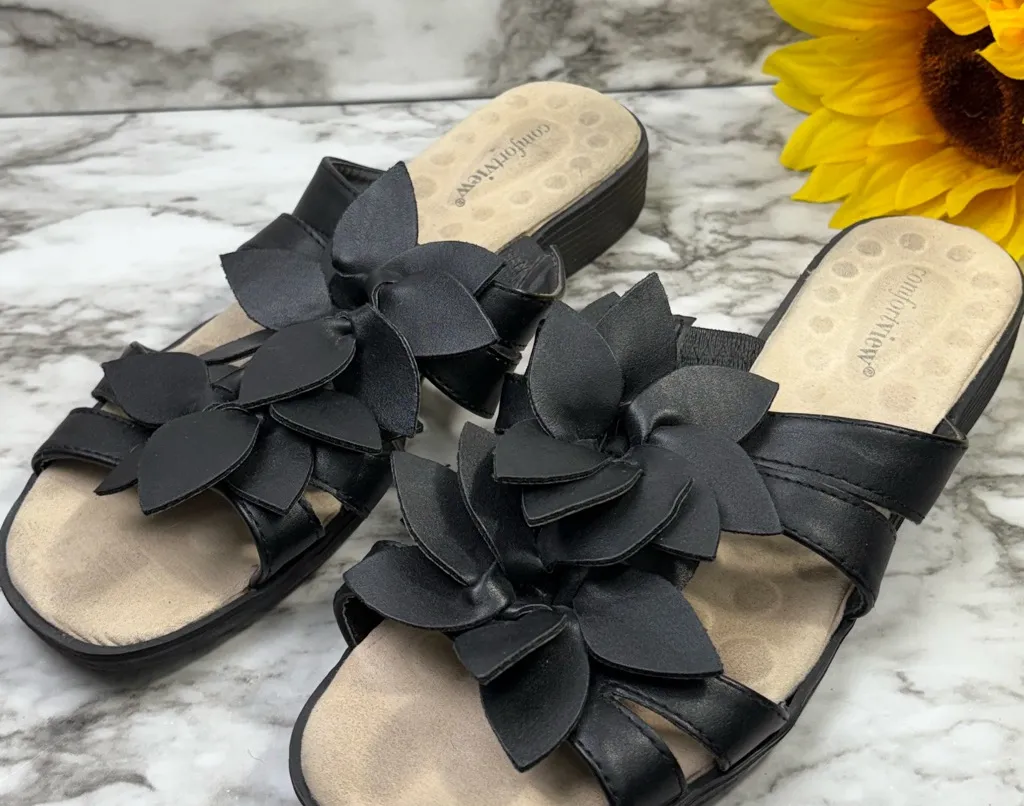 Chic black sandals with floral accents. Designed for comfort and style.Step into all-day comfort and style with these Comfortview black floral sandals. Featuring beautiful 3D flower appliqués and cushioned insoles, these slides combine fashion and support for everyday wear. Details: • Brand: Comfortview • Color: Black • Style: Floral Slip-On Sandal • Material: Faux leather upper • Heel Height: ~1.5” wedge • Cushioned insole with circular comfort pads • Textured rubber sole for traction • Size: 9.5M • Condition: Gently preowned with light wear to footbeds and soles (see photos for details). Perfect for: Spring and summer outfits, casual days, or comfortable vacation wear.