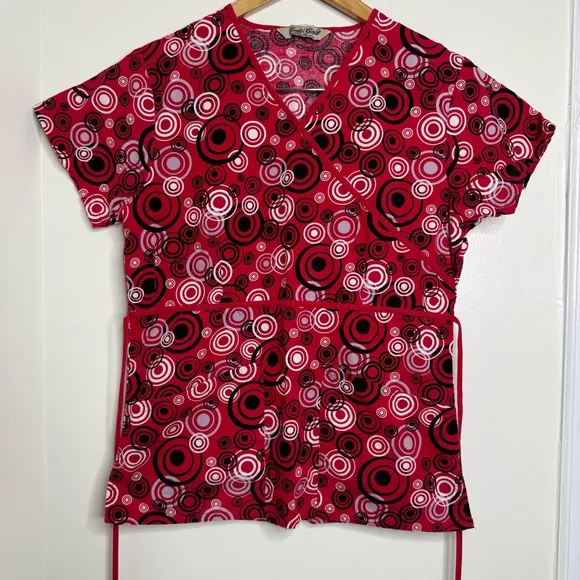 I’m pretty sure this is tagged an XS but please check measurements before purchasing. I have a bunch of other XS scrub tops for sale in my closet if you’d like to bundle Ties in back.