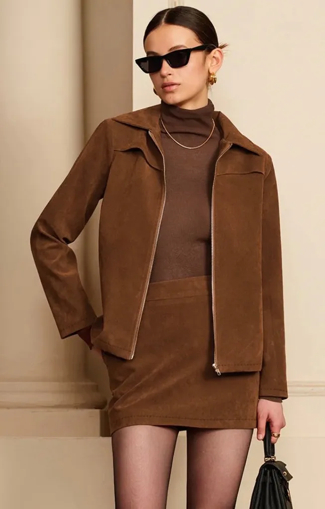 Commense Suede Zip Front Bomber Jacket Minimalist Contemporary Camel Brown XS Excellent Preowned C... Show more