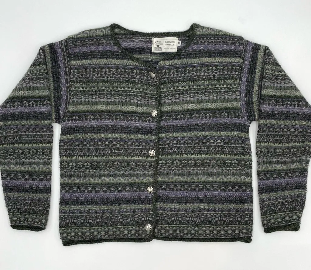 Common Threads cardigan sweater in a wool blend. Beautiful toned down greens and purple colors. Unique silver colored buttons with a cut-out design. Professionally dry cleaned Condition: Gently preloved with normal wash wear, tarnishing on buttons, and some minor flipping at the hem and cuffs. No holes or stains. Size: Medium. See approximate measurements for best fit. Pit to pit: 20" Length: 22.5" Professionally dry-cleaned and from a smoke-free home. Fast shipper! Cottagecore, goblincore, forestcore, naturecore, earthcore, oxford, dark, moody, earthy, mossy, rustic, forest, mushroom, practical, muted, layered, natural
