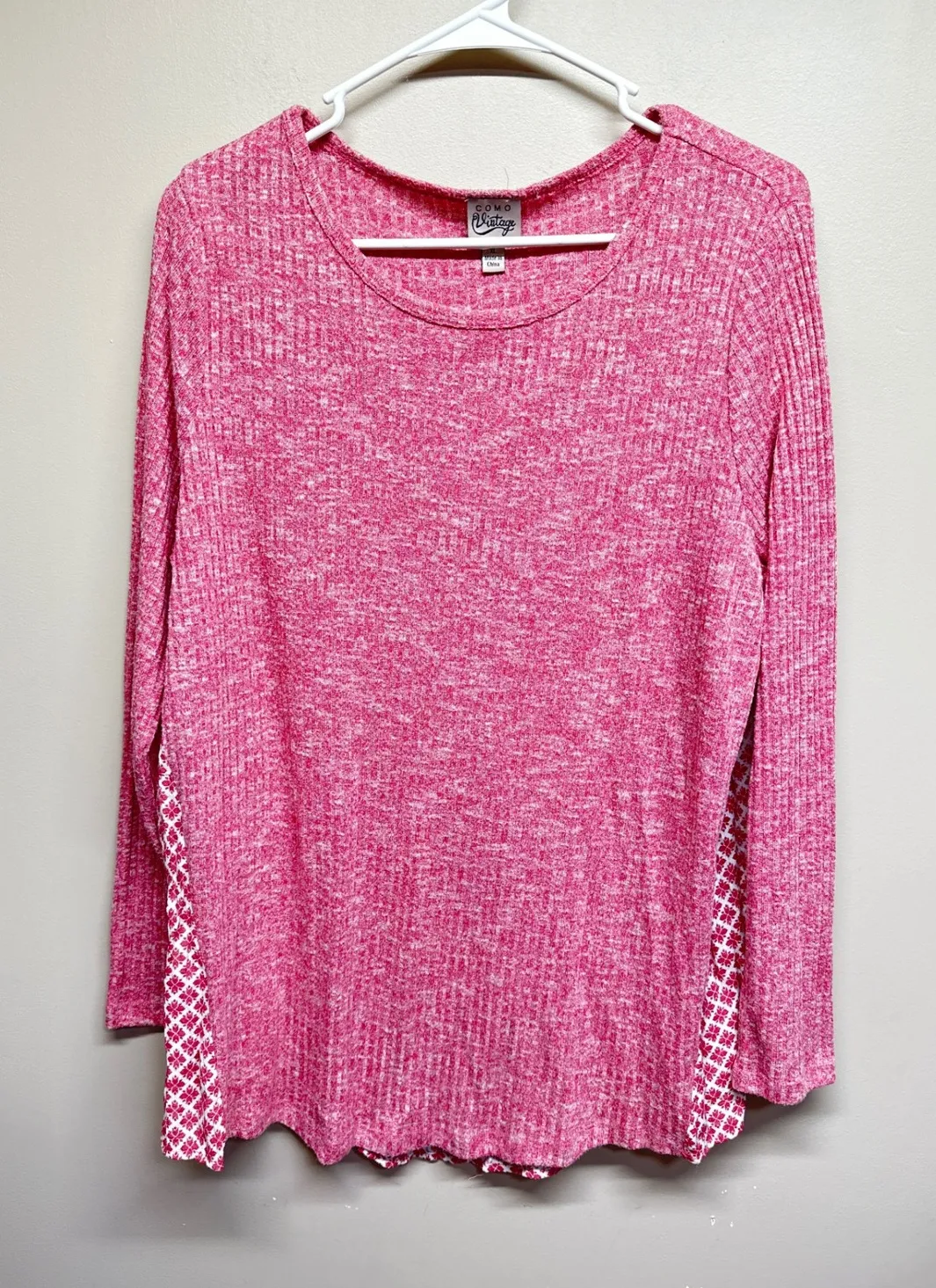 COMO Vintage pink marled ribbed long sleeve top. This comfortable top features a marled pink knit body with contrasting geometric print panels on the sides and back hem. The scalloped hemline adds a playful touch. Perfect for casual outings or relaxed weekends. Type: T-Shirt Department: Women Style: Basic Material: Polyester, Rayon, Cotton Blend Neckline: Round Neck Sleeve Length: Long Sleeve Sleeve Type: Classic/Fitted Sleeve Pattern: Geometric Features: Stretch Fit: Regular Fabric Type: Knit Occasion: Casual Closure: Pullover Season: Spring, Fall Keywords: comovintage, pinktop, marledknit, ribbed, longsleeves, geometricprint, scallopedhem, casualwear, weekendstyle, comfortable, womensapparel, everyday, layeringpiece