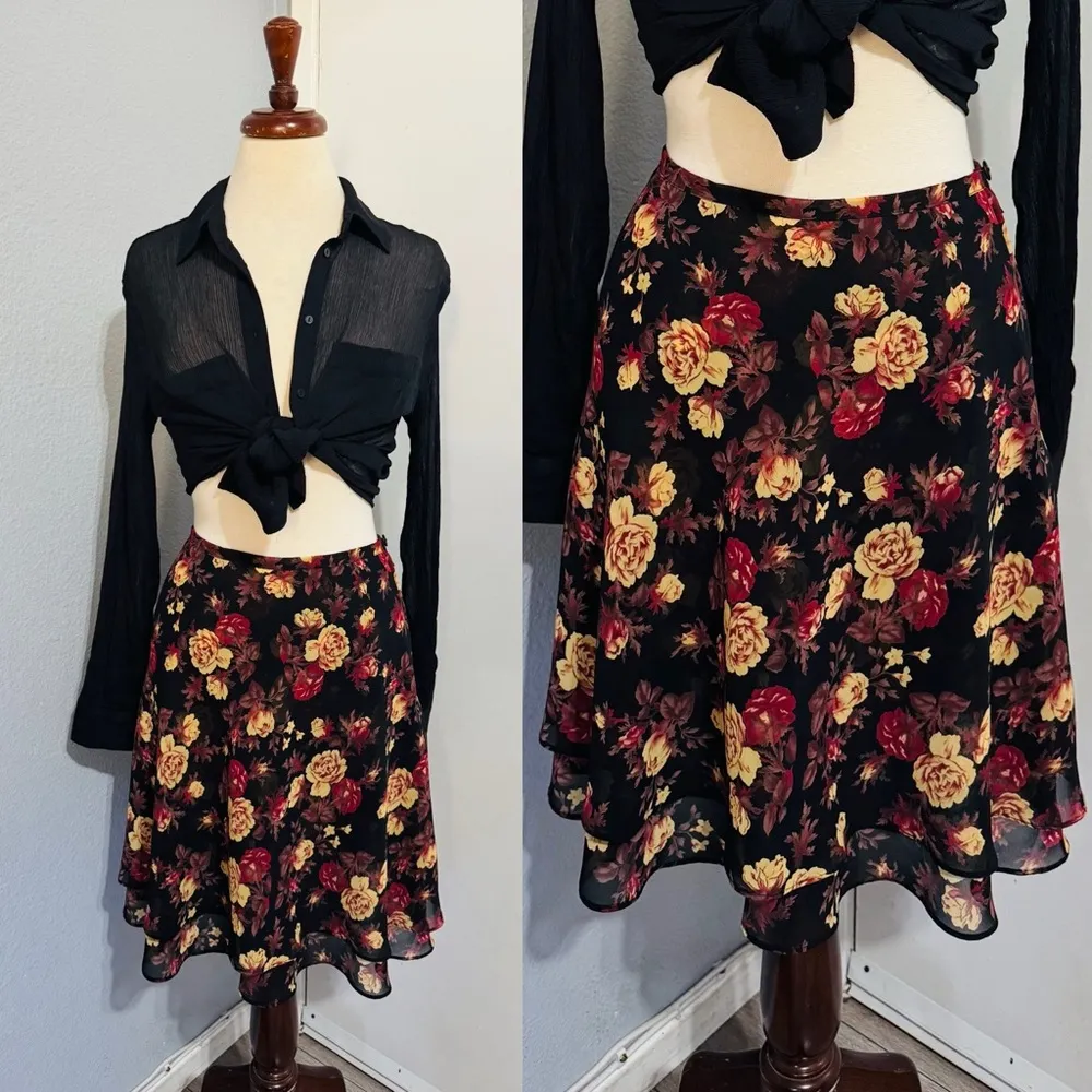 This vibrant midi skirt from Express features a playful skater style with a ruffled design. The skir... Show more