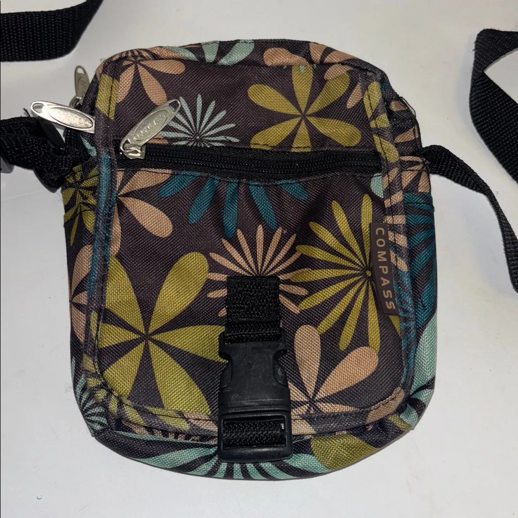 Stylish crossbody bag with floral design. Features a zippered pocket and adjustable strap. LOTS OF POCKETS OUTSIDE AND INSIDE DOUBLE ZIPPER CLOSURE ON TOP CLIP CLOSURE OPENS TO 2 OTHER ZIP POCKET CLOSURES PRELOVED SOME MARKS INSIDE INTERIOR GOOD CONDITION ❤️