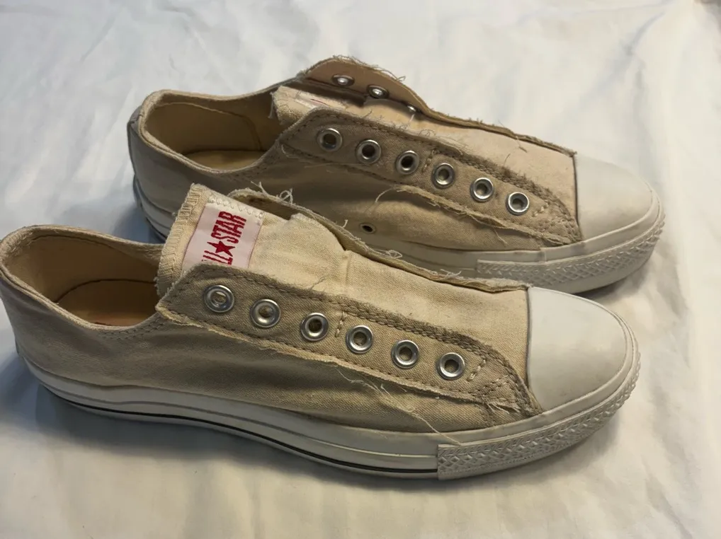 Stylish ivory low-top sneakers with white soles. Features metal eyelets and a comfortable fit.