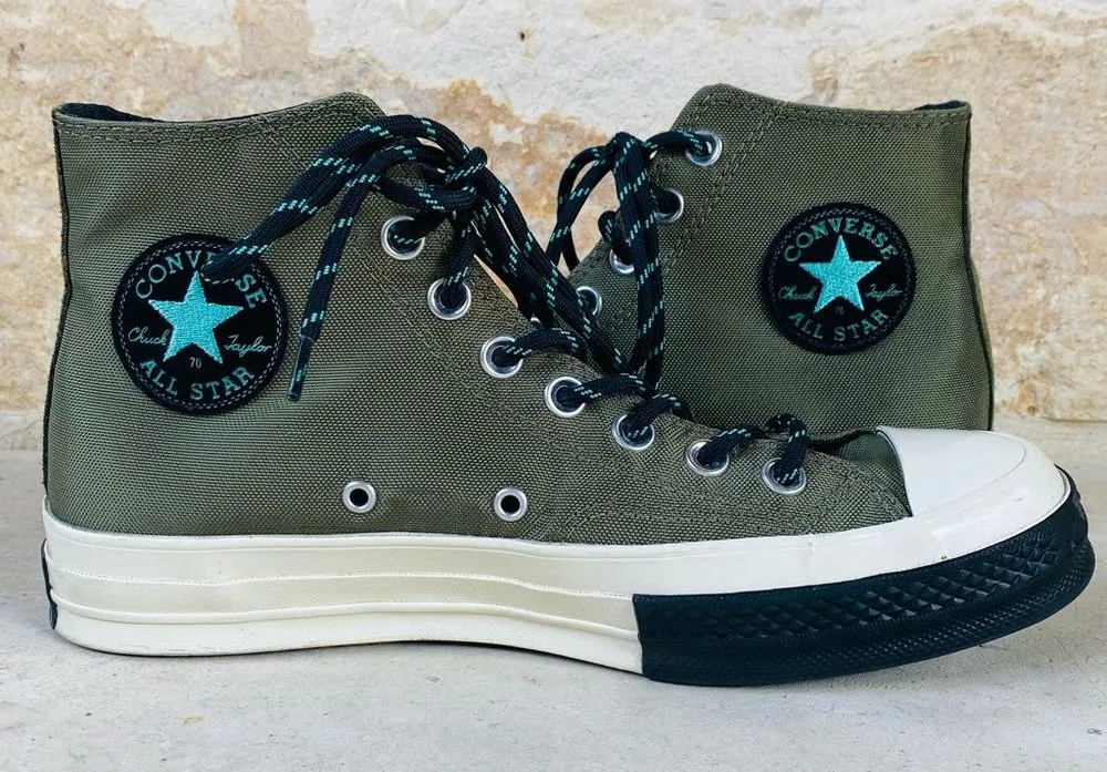 Converse Chuck Taylor All Star Hi 70 Awesome old school throwback 70s 80s vibe High Top Hi top sneakers Size: 9.5 Womens /Mens 7.5 - UK 7.5 EUR 41 CM26 Color: Field Surplus (olive green) canvas & Egret (cream white) w/aqua teal accents Good pre-owned condition, worn once - some marks on the cream/white areas In Spring 2013 Converse re-issued the All Star Chuck 70. The brand has incorporated subtle touches and finishes that pay homage to 1970s legends in sports and music. The Classic Chuck 70 gets a seasonal upgrade with premium vintage canvas materials and Utility Green color from the Converse Archives. Lightweight canvas upper with rubber sole. Lace-up front closure with metal eyelets. Glossy outsole. Medial eyelets enhance airflow. Classic All Star ankle patch and vintage license plate. Rubber toe cap Elevate your sneaker game with these Converse Chuck Taylor All Star 70 Hi-Top sneakers. Designed for both men and women, these shoes feature a lace-up closure and a solid green canvas upper material. High top cut providing extra ankle support during any athletic activity. These sneakers are part of the Converse Chuck Taylor All Stars Hi product line. The outsole material is made of rubber, ensuring durability and traction. The insole material is made of fabric for a comfortable fit. These shoes are perfect for any casual or athletic occasion. Olive green canvas with a black and aqua/teal star patch