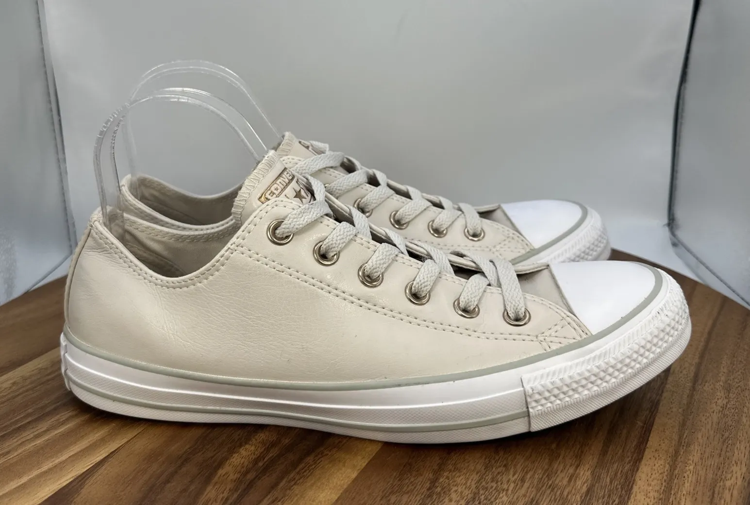 Low top Lace up closure Leather upper, canvas interior Preowned. Minor wear/stains to the midsoles.... Show more
