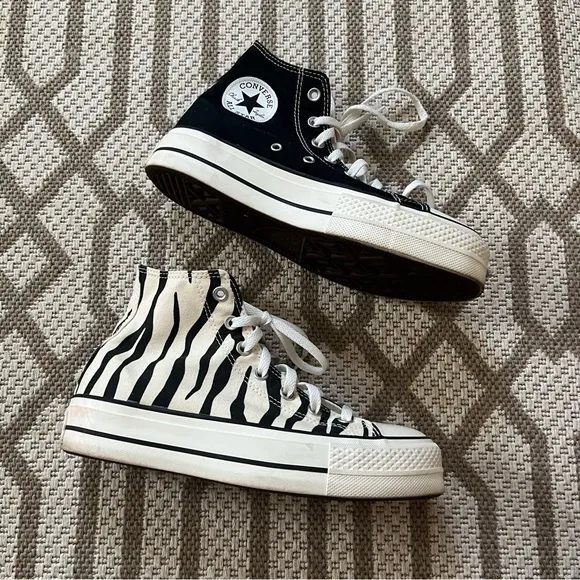One side of shoe is zebra (exterior) and other side is black (interior) High top style, platform S... Show more