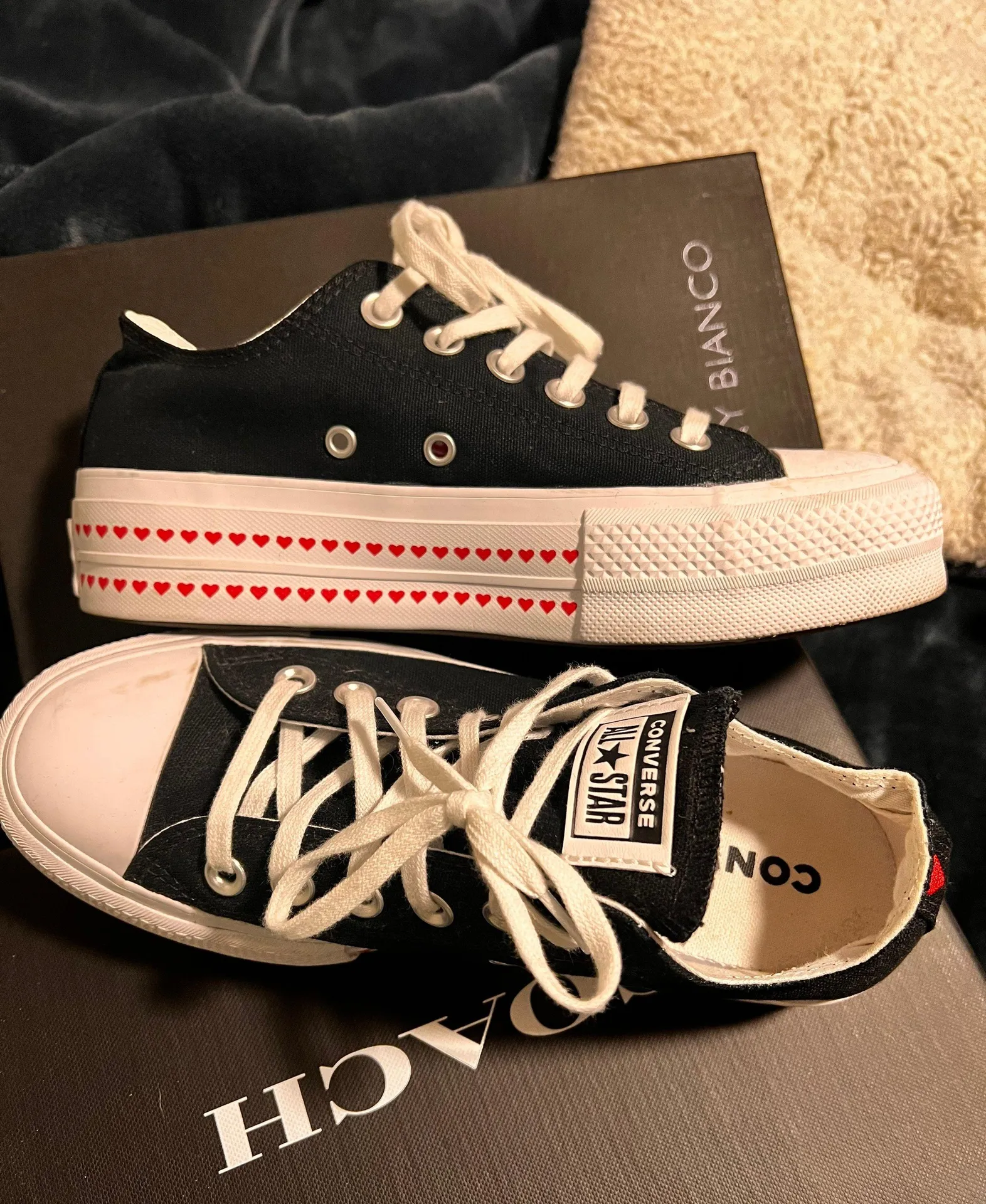 Super cute platform converse with hearts on them worn once! The inside says love yourself first