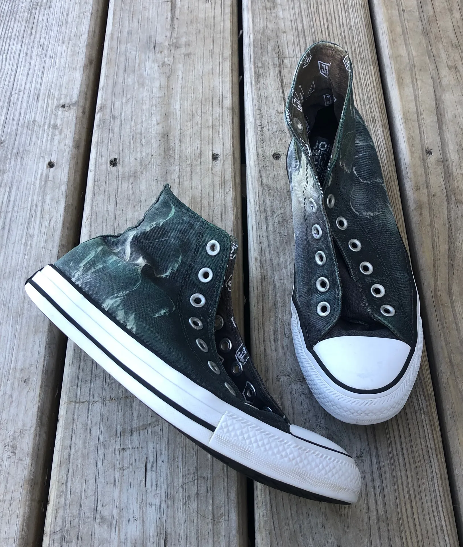 Converse Sneakers Chuck Taylor All Stars High-Top Canvas upper Rubber sole and toe cap DC Justice League JL printed on inside Join the League printed on tongue Dark silhouette of JL heroes - Batman, Wonder Woman, The Flash, Cyborg, Aquaman Faded, shoes have an all over green tint to them No laces Size - Women’s 9, Men’s 7 Smoke free, pet friendly home Good used condition