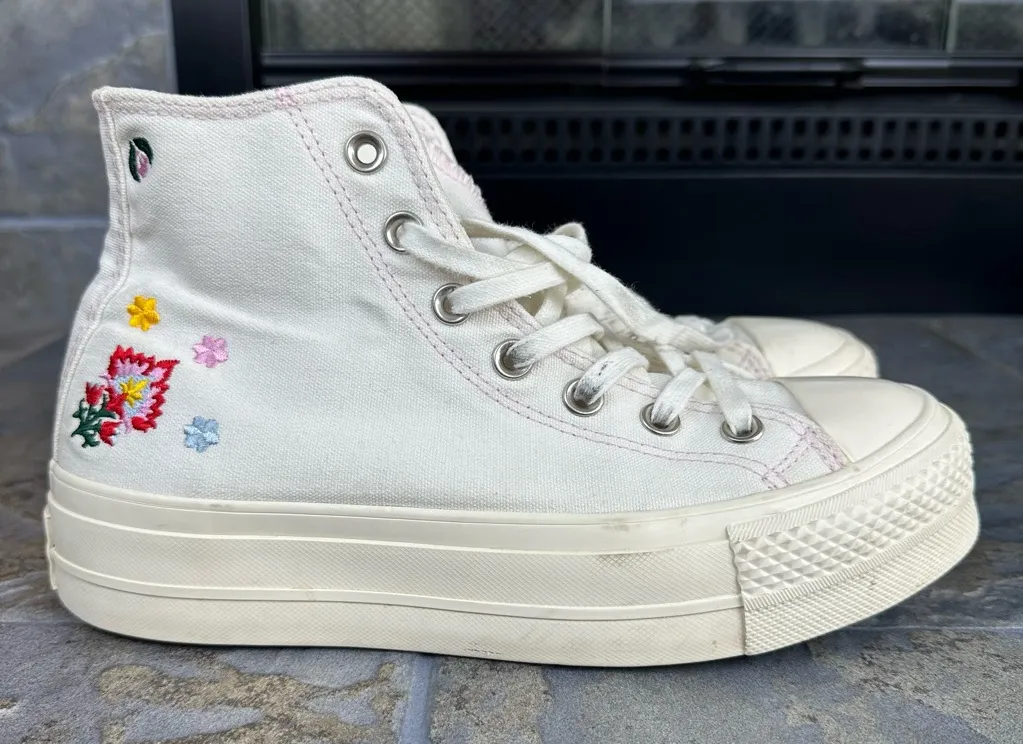 Stylish Converse high-top sneakers. White canvas with colorful floral embroidery. Perfect for casual... Show more