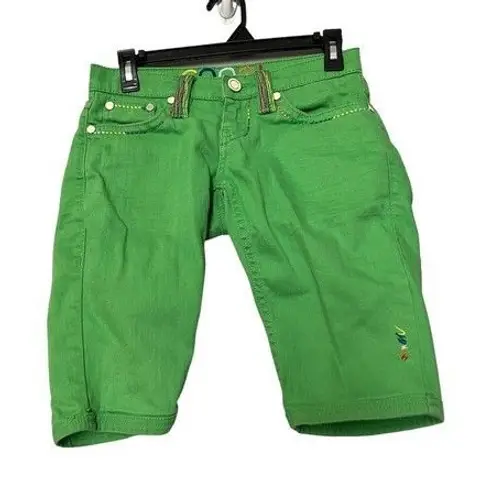 Green with multicolored embroidery Perfect for summer Size 1/2 waist 33.5 Approximate Laid flat measurements: length 18 in, waist 14 in, inseam 12 in Missing thread spot on bottom hem, doesn’t effect hem Smoke free pet friendly home