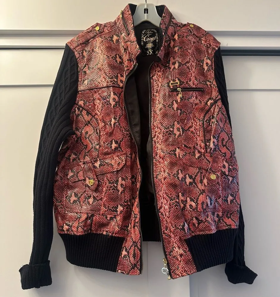Coogi Vintage Red and Pink Faux Snake Zip Up Jacket Size 3X Zip Front closure. Black ribbed sleeves. A couple minor lose threads as pictured but no major flaws to note; overall very good used condition. Open to offers, no trades. #0160