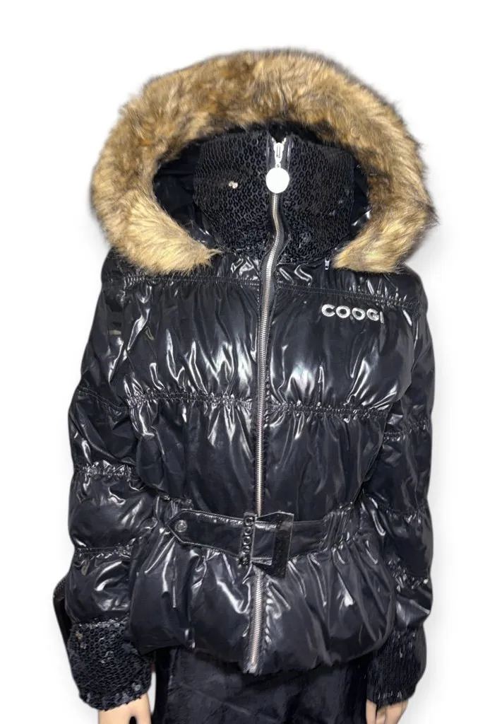 Glossy black jacket with cozy faux fur trim. Features a stylish belt and secure zip closure. Measur... Show more