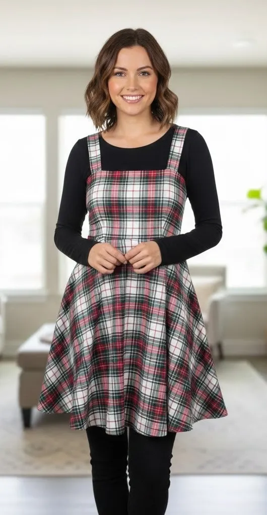 Embrace charming style with this plaid pinafore dress. The classic red green and white plaid patter... Show more