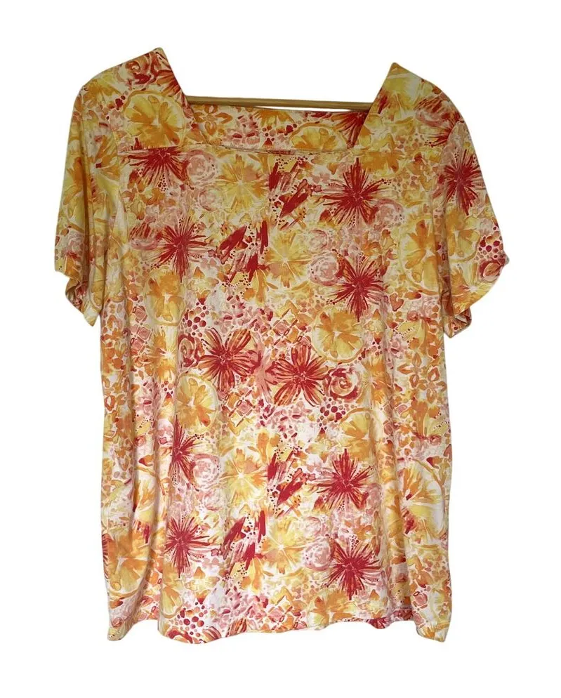 This Coral Bay shirt is a beautiful addition to any wardrobe. Featuring a vibrant red and yellow floral print on comfortable cotton fabric, it offers a cheerful and stylish look. The square neckline adds a touch of elegance, making it suitable for both casual and semi-formal occasions. In excellent condition and from a smoke-free home, this top has been well-cared for and is ready to be enjoyed by its next owner. The XL size ensures a comfortable and flattering fit for various body types. Don't miss out on the opportunity to own this lovely Coral Bay floral shirt!