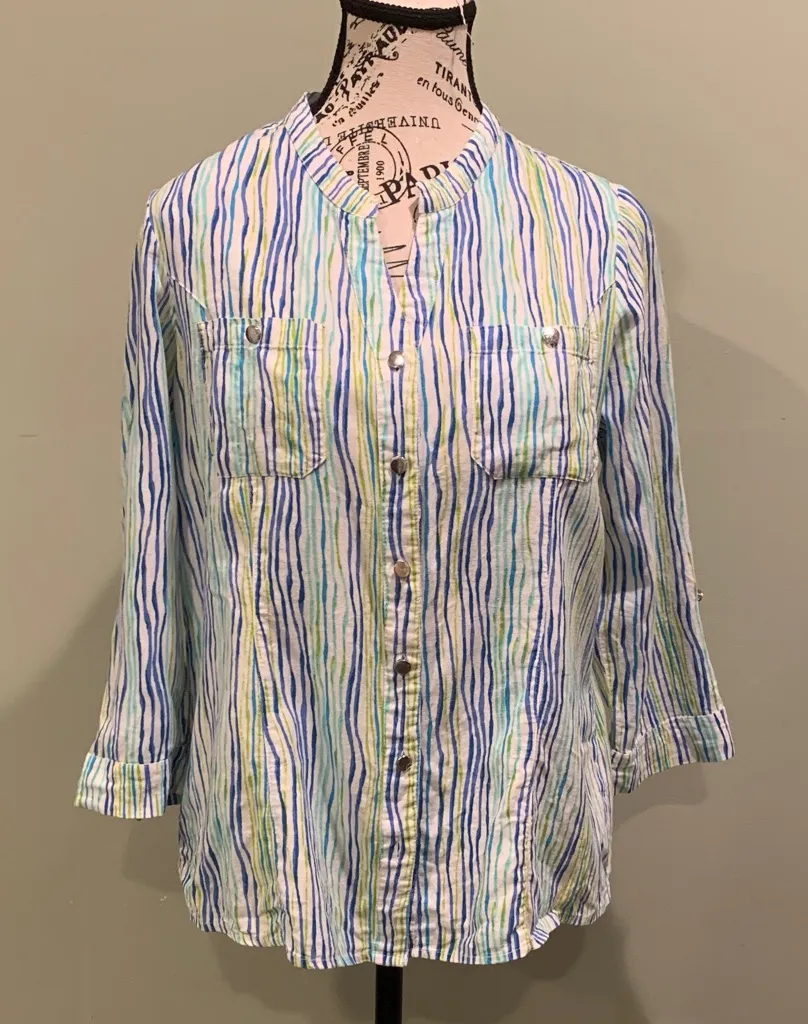 Pre-owned in very good condition. Some of the buttons show wear, but you really have to be looking for it. Linen rayon blend. Green blue and white squiggly stripes. Roll tab sleeves. 20.5” across chest 23.5” from highest point on shoulder to hem H020