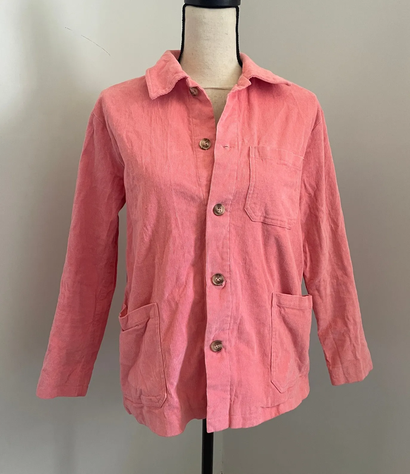 Measurements: • Sleeve Length: 22 inches • Chest (pit to pit): 20 inches • Length: 24 inches Type: Jacket Outer Shell Material: Cotton Style: Basic Jacket Department: Women Lining Material: Cotton Theme: Paris Fabric Type: Corduroy Features: Collared, Pockets Accents: Button Pattern: Solid Season: Spring Closure: Button Occasion: Casual Keywords: FRNCH Paris, corduroy jacket, pink jacket, shirt jacket, overshirt, utility jacket, women's jacket, XS, extra small, casual jacket, button up jacket, cotton jacket, spring jacket, lightweight jacket, outerwear, #western #barn #chore #utility #girly #girlhood #girlhoodcore #pretty #preppy #softgirl FRNCH Corduroy Button Up Shacket sz XS Pink Jacket Utility Soft Girl Chore Coat Excellent
