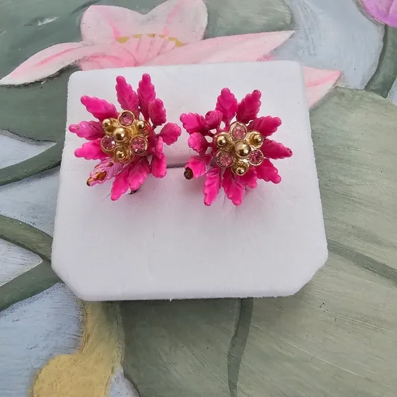 Coro Vintage Hot Pink Flower Enamel Rhinestone Gold Tone Metal Clip on earrings **Vintage Jewelry Condition Disclaimer** All vintage jewelry pieces are unique and may exhibit signs of wear consistent with their age. Each item is inspected for authenticity and overall condition, but minor imperfections such as surface scratches, tarnishing, or slight color variations are expected. Descriptions and photographs are provided to give a clear representation of the jewelry’s condition. Due to the inherent fragility of vintage and antique items, I sometimes choose not to clean them to avoid potential damage to their delicate materials or finishes. Restoration or repairs may have been made, and some wear and tear is typical. I strive to accurately describe and represent each piece, but please contact me with any specific condition concerns prior to purchase.