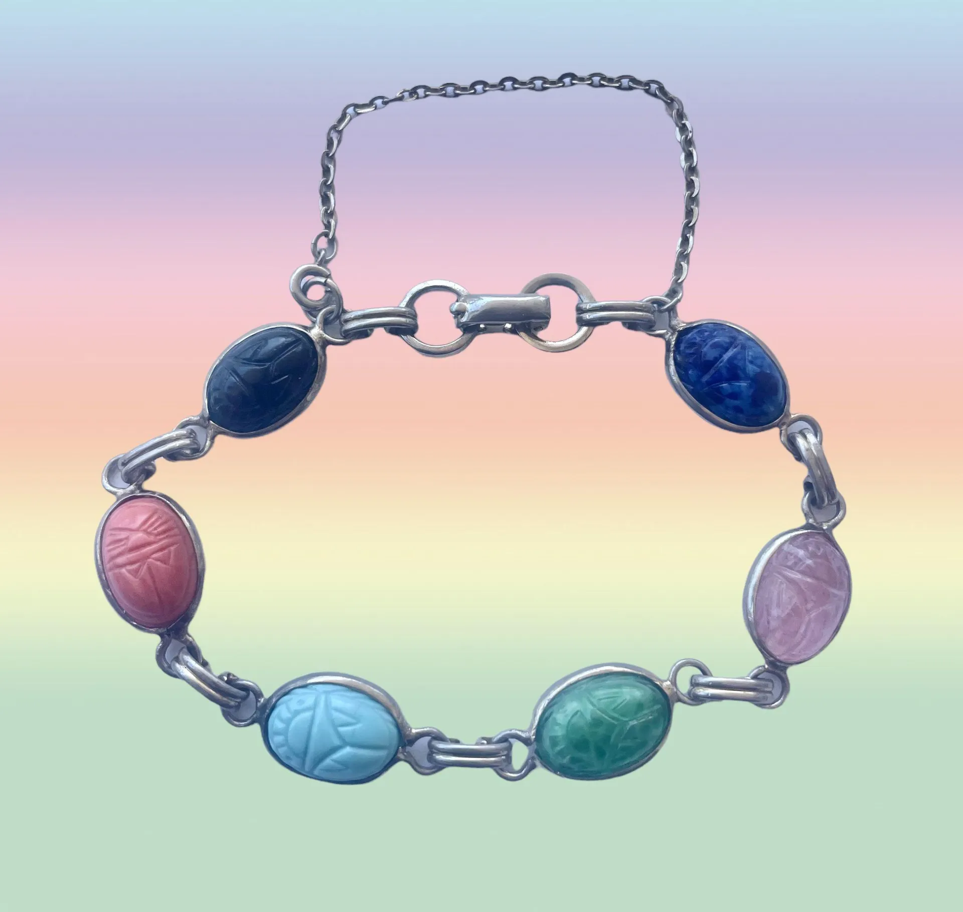 In excellent vintage condition. Silver tone. Clockwise: Sodalite, amethyst or rose quartz, malachite, turquoise or dyed howlite, coral, onyx stones. Box clasp with safety chain. 7”