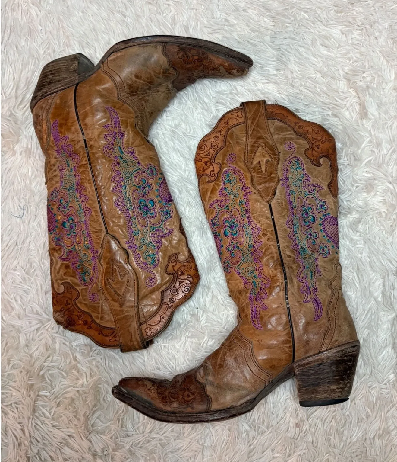Exquisite embroidery cascades down these brown leather cowboy boots. These Corral boots feature ornate detailing from the pointed toe to the scalloped top line, showcasing a beautiful combination of traditional craftsmanship and contemporary style. Turquoise lining adds a pop of color that is unique to this pair of boots. Picture yourself wearing these to a country music festival, a casual barn dance, or even just adding a touch of Western flair to your everyday style. Please take note to wear and tear on bottom of boot! Still a lot of life Price reflects Size 6.5 Keywords: Corral Boots, Western Boots, Cowboy Boots, Embroidered Boots, Leather Boots, Women's Boots, Pointed Toe Boots, Brown Boots, Turquoise Lining, Riding Boots, Country Style, Fashion Boots, Rustic, Bohemian