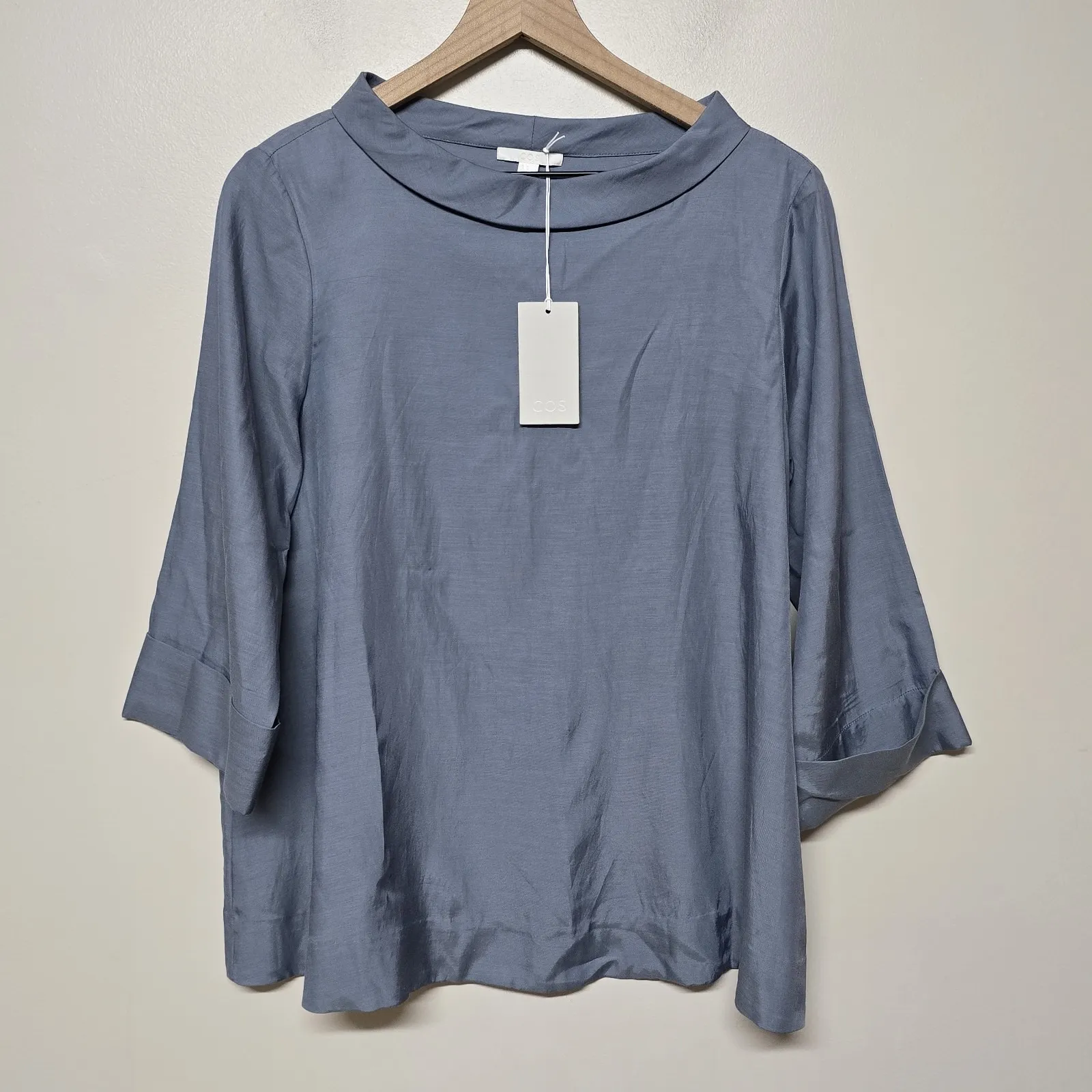 The COS Blouse is a minimalist and modern women's top in a size 10 and blue color. It features a funnel neck and 3/4 sleeves, making it a stylish choice for the contemporary woman. Made from a blend of cotton and cupro, this blouse from the designer brand COS offers a classic and fitted sleeve style. Perfect for those who appreciate a blend of designer and preppy elements in their wardrobe, this tunic-style blouse is a versatile piece that can be worn in various settings.