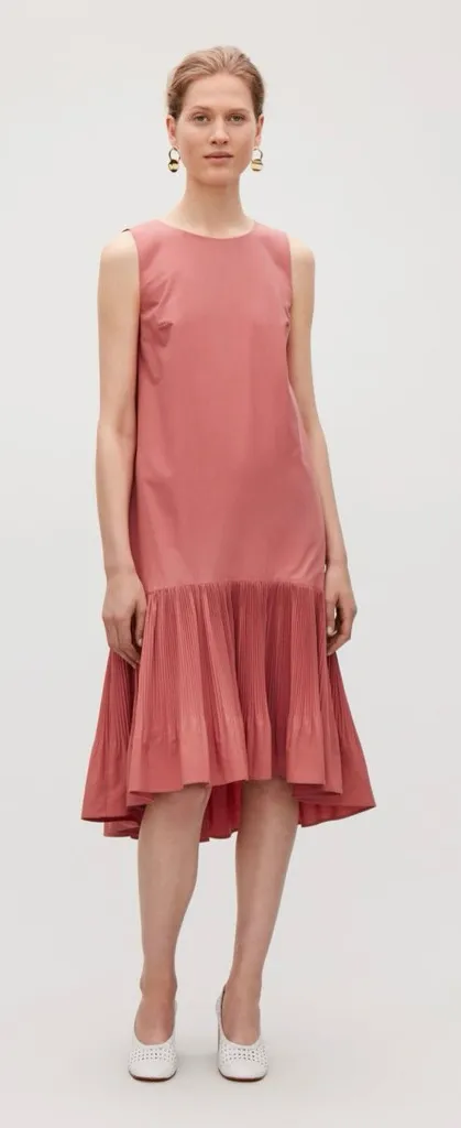 This pleated dress is made from crisp cotton poplin with a pleated panel that gradually fades towards the hem. A straight, sleeveless cut that flares at the hem, it has a round neck and a concealed back zip fastening. Pockets! 100% Cotton Machine washable Front length: 40” back length 46” Excellent preloved condition BIN650
