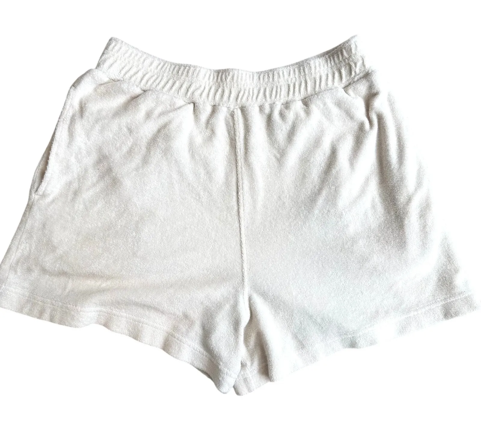 COS Terrycloth Athleisure Sweat Shorts w/ Pockets Color is an off white or light tan Elastic waistband Women's XS Waist flat - 14" Rise - 15" - Ultra High Rise Inseam - 3" Great condition, no stains or tearing