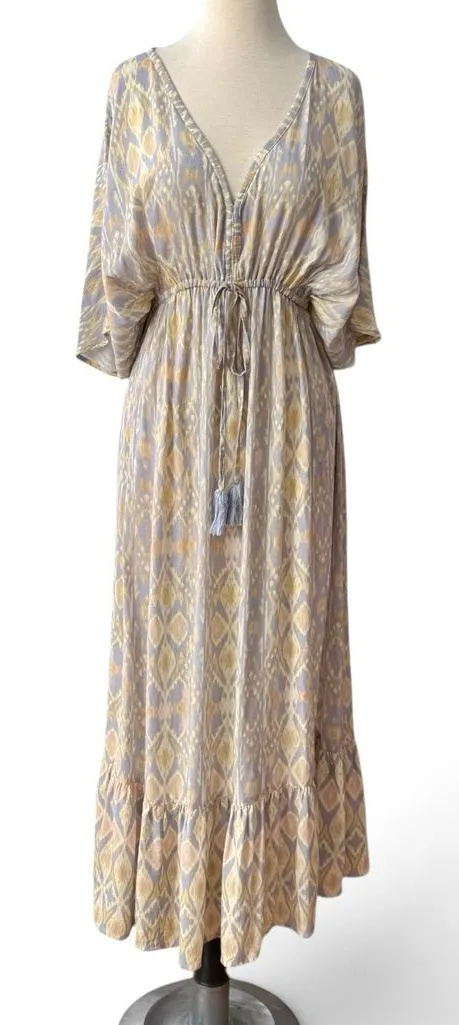 • Gently worn preowned condition. No damage or flaws. • White and blue geometric Ikat pattern • Super soft, elastic empire waist, v-neck with tassel ties, flowy kimono-style sleeves, and side pockets. Measurements • Waist: 16” (easily stretches to 20”) • Length (Shoulder to Hem): 50” Keywords: Cost Plus World Market, Mira Dress, Kaftan, Caftan, Ikat Print, Bohemian, Boho Chic, Festival Wear, Beach Coverup, Resort Wear, Summer Dress, Geometric Pattern, Purple and Yellow, Tassel Ties, Flowy Dress, Relaxed Fit, Kimono Sleeve, Travel Outfit, Hippie, Artsy, Wearable Art