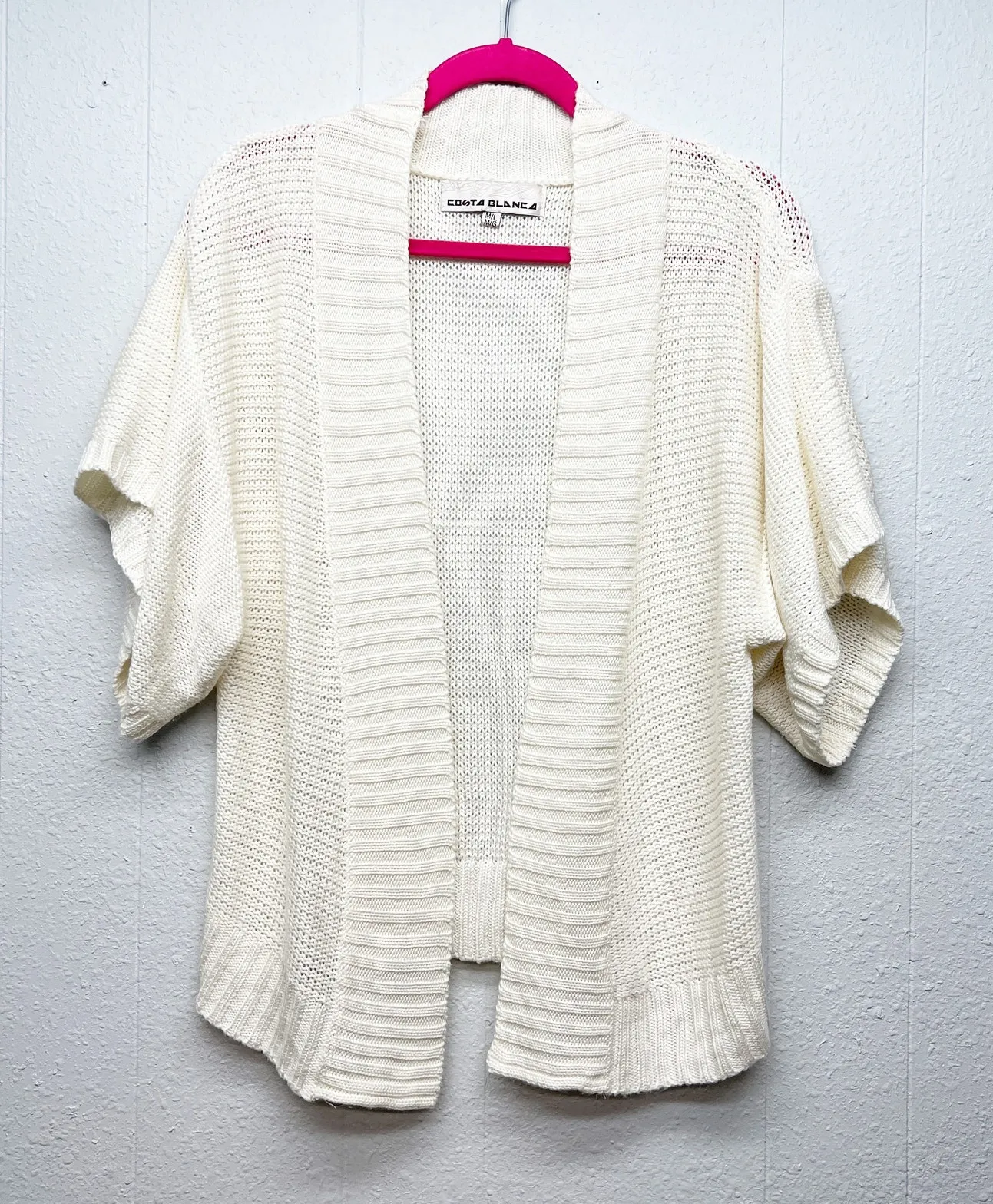 Costa Blanca women's white knit cardigan. Open front. Short wide sleeves. Ribbed trim. Does not include waist tie. In good used condition. No stains, tears or holes. 100% acrylic. Hand wash. Length: 24"