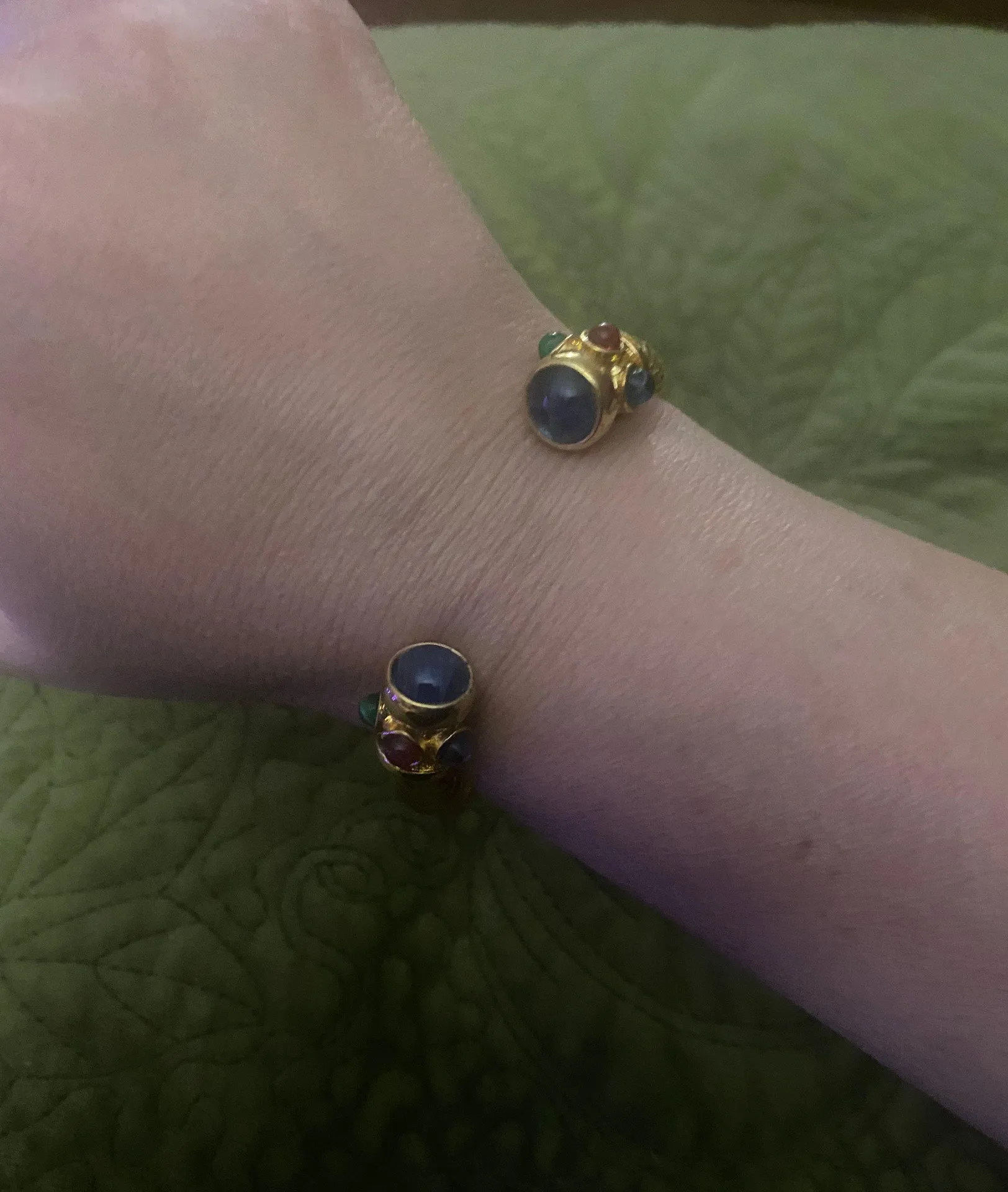 Fun bracelet that is a golden color with pretty stones adorning it. It hasn’t been worn but it’s been sitting in a case for quite some time. My grandma owned a boutique and after she passed, I decided to sell some of the things… 🙏🏻🫶