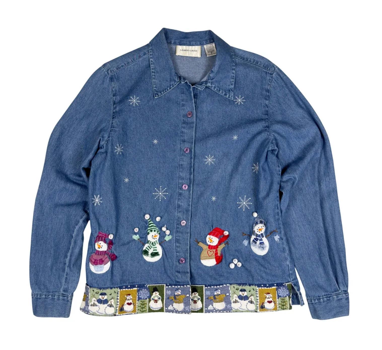 Here's a late 90s winter cottagecore denim shirt covered in embroidered snowmen, stitched snowflakes... Show more
